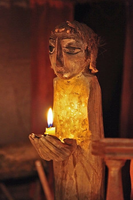 Младенец в вертепе, как правило, — туго скрученный жгутик из белой материи; овечки, с которыми приходит поклониться Христу пастух, — кудрявый комочек пряжи. Как правило, герои в вертепе деревянные или тряпичные, из простого дешевого материала — их легко смастерить, легко переносить.